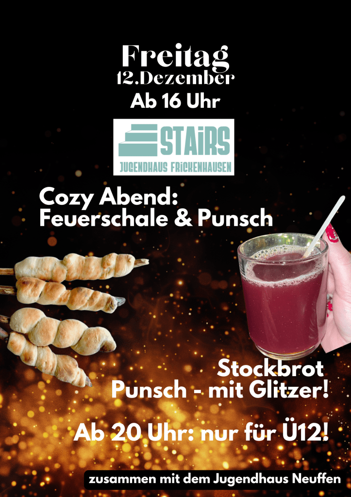 am 12.12. machen wir ein letztes mal für dieses Jahr lange auf. Mit dabei wird Rouven aus dem Jugendhaus Neuffen sein. Zusammen machen wir Stockbrot, spielen Spiele und machen worauf wir Lust haben. Im Innenhof stellen wir die Feuerschale auf und drinnen gibt es warmen Punsch – wer mag: mit Glitzer! Wir freuen uns auf euch und einen letzten langen Abend zum Ende von 2025.