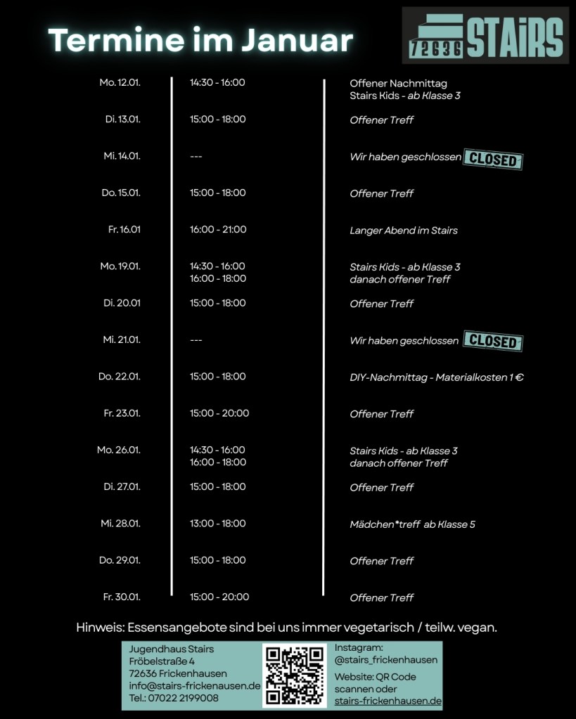 Gleich am Freitag, 16.01. geht’s los mit unserem ersten langen Abend für dieses Jahr. Wir sind bis 21 Uhr für euch da. Ab nächsten Montag startet unser Grundschulprogramm unter neuem Namen. Zum Stairs Kids sind alle Kids ab der dritten Klasse immer Montags von 14:30 – 16:00 Uhr eingeladen. Das Programm entnehmt ihr dem Flyer. Am Donnerstag 22.01. erwartet euch während des offenen Treffs ein cooles Kreativangebot beim DIY-Nachmittag und am Mittwoch, 28.01. findet für alle Mädchen* unser erster Mädchen* Treff im neuen Jahr statt.