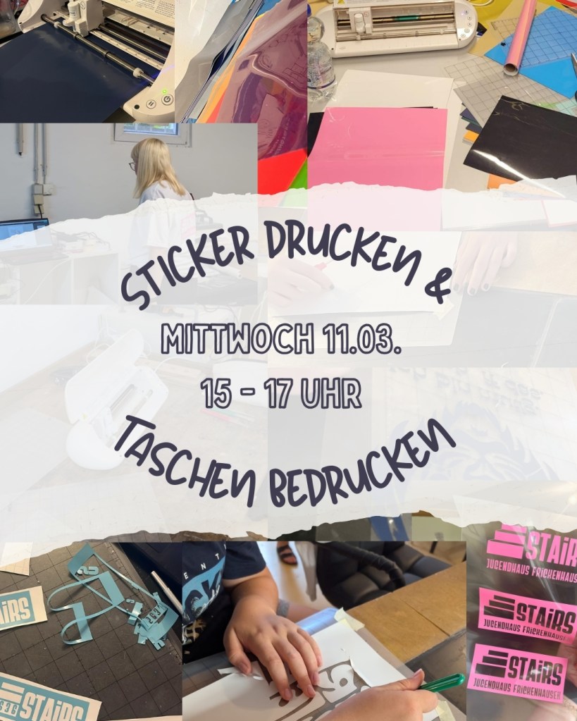Am 11.03. (Mittwoch) um 15 Uhr im Stairs: Sticker drucken und Taschen bedrucken. Taschen kosten 2€ und Drucke 0,50ct – 1€ (eine Seite). Gerne könnt ihr auch Textilien aus Baumwolle (Shirts, Taschen, Pullis..) mitbringen und vor Ort bedrucken.