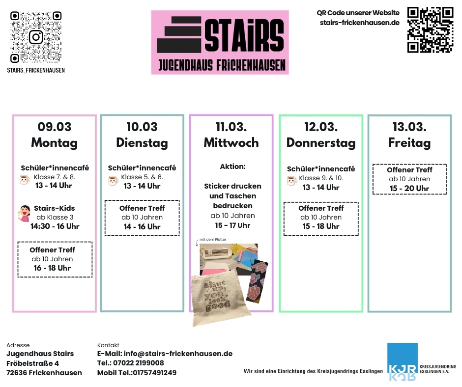 Die Öffnungszeiten vom 09.03. – 12.03. Special in der Woche: Kreativ Aktion ‚Sticker drucken und Taschen bedrucken‘ von 15 – 17 Uhr am Mittwoch den…
