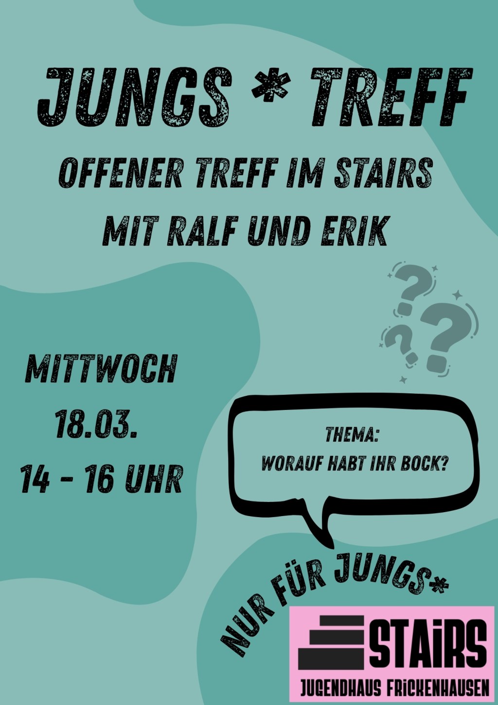 am Mittwoch den 18.03. 14 – 16 Uhr im Stairs: Jungs*treff im Jugendhaus Stairs – mit Ralf und Erik. Das ist das erste Treffen nur…