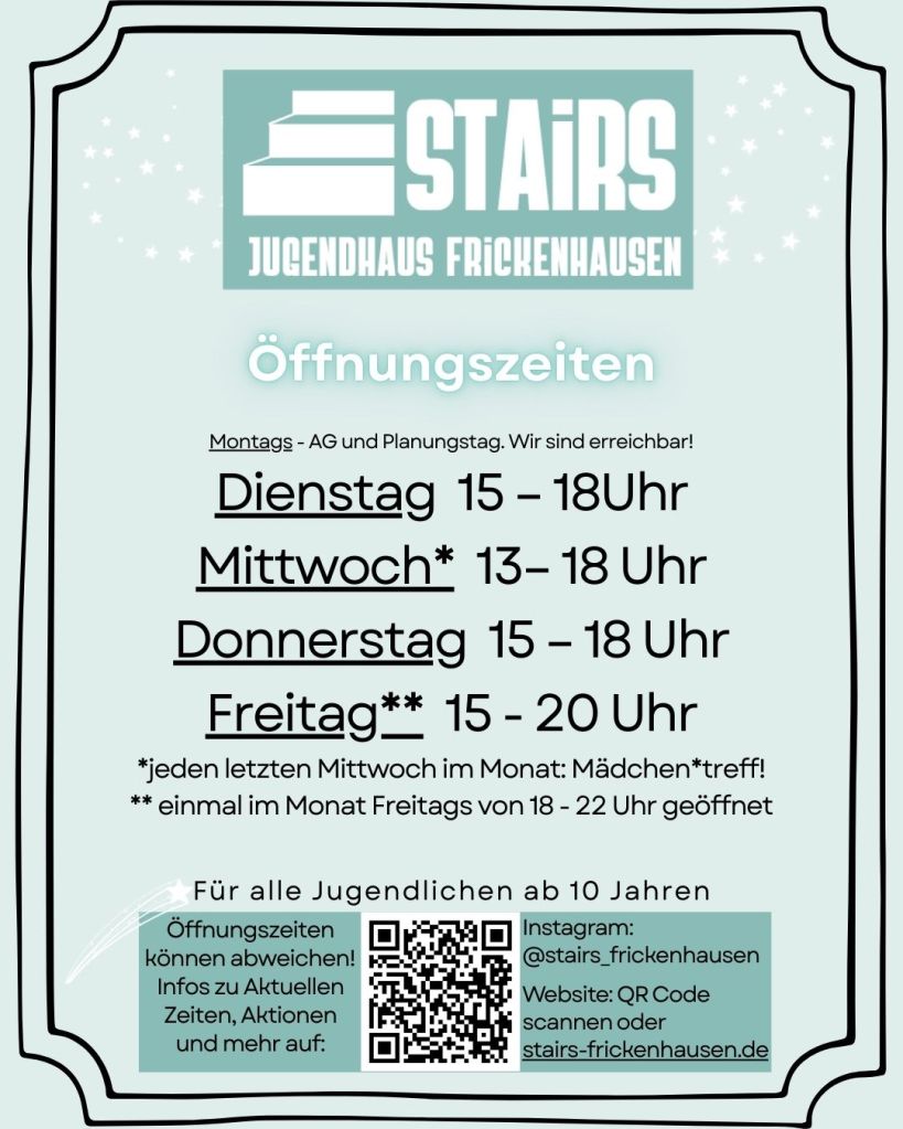Wir laden herzlich zum STAIRS-Kids ein!Die Angebote richten sich an Kinder ab der 3. Klasse und finden montags von 14:30 bis 16:00 Uhr statt. Die Treffen werden von den FSJler*innen gestaltet und von Fachkräften begleitet. Nach dem Stairs Kids öffnet das Jugendhaus für alle Kinder und Jugendlichen ab 10 Jahren von 16:00 – 18:00 Uhr.…
